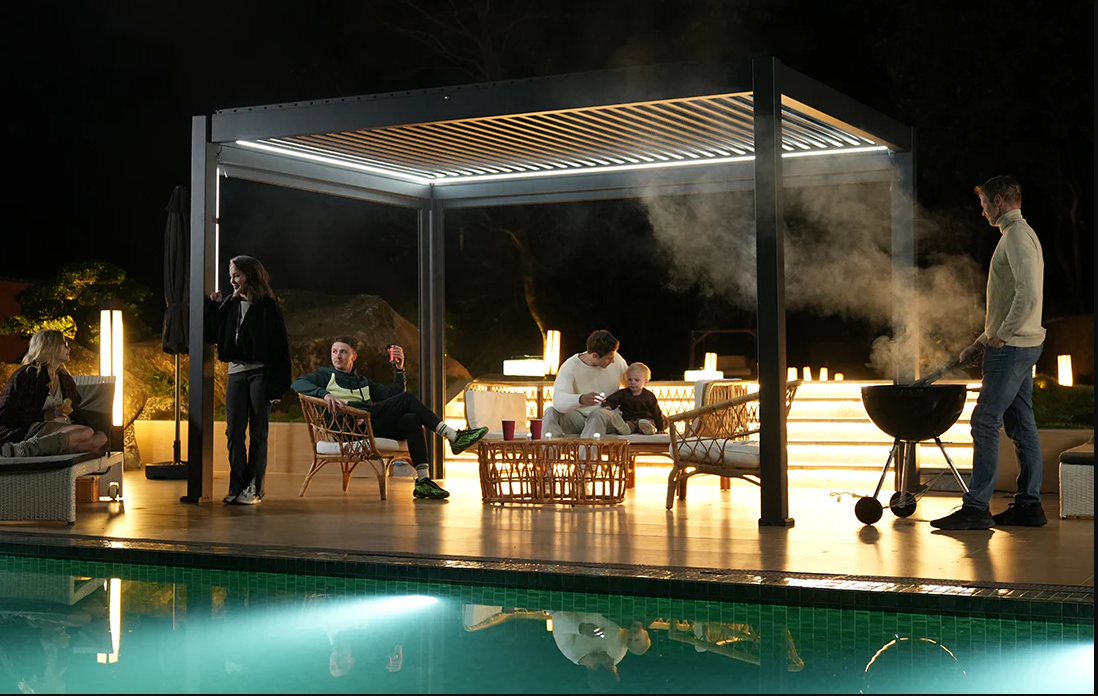 the 10x13 pergola is equipped with motorized louvres to adjust natural light, side shades and dimmable led lights. Pick from amount of shades and incorporate the pergola into your smart home system!